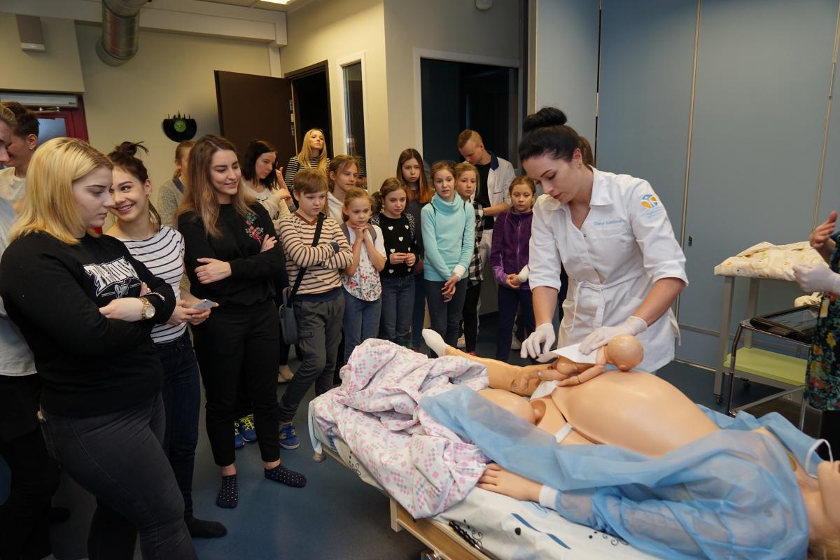 Üliõpilased Keidy-Anet ja Hanna-Maria tutvustasid Pae ja Laagna gümnaasiumi õpilastele ämmaemanda eriala. Üliõpilane Diana Sokolova näitas õpilastele kõrgtehnoloogilise simulaatori abil, kuidas laps sünnib, ning selgitas parema arusaamise tagamiseks seda nii eesti kui ka vene keeles. Lapsed said üliõpilaste käest küsida kõike, mis sünnitusega seotud, ning ise simulatsioonis sünnitust ka vastu võtta. Huvilised palpeerisid raseda kõhtu, et loote asendit hinnata, võtsid vastsündinut sülle, tegid talle esimese läbivaatuse ning panid ta riidesse.