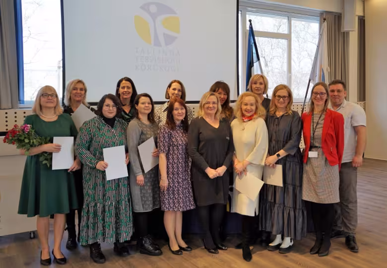 Pildil koolitusprojekti lõpetajad, rektor Ülle Ernits (keskel) ja õenduse õppetooli õppejõud-lektor Kadri Kööp (paremalt teine). Palju õnne!