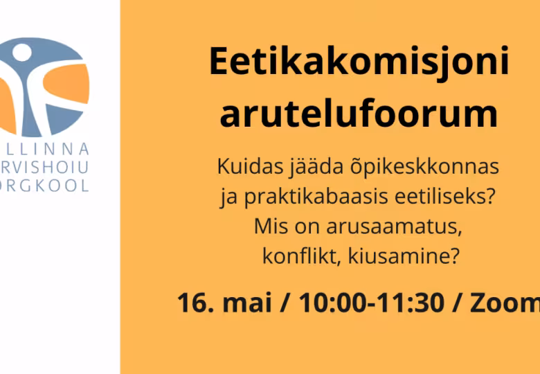 Tallinna Tervishoiu Kõrgkooli eetikakomisjon kutsub 16. mail kell 10:00-11:30 arutelufoorumile "Kuidas jääda õpikeskkonnas ja praktikabaasis eetiliseks? Mis on arusaamatus, konflikt, kiusamine?". Arutelu toimub Zoomis.