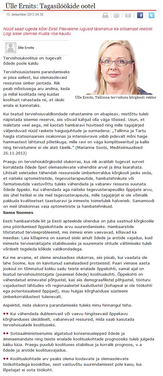 - Ülle Ernits: Tagasilöökide ootel (Eesti Päevaleht)