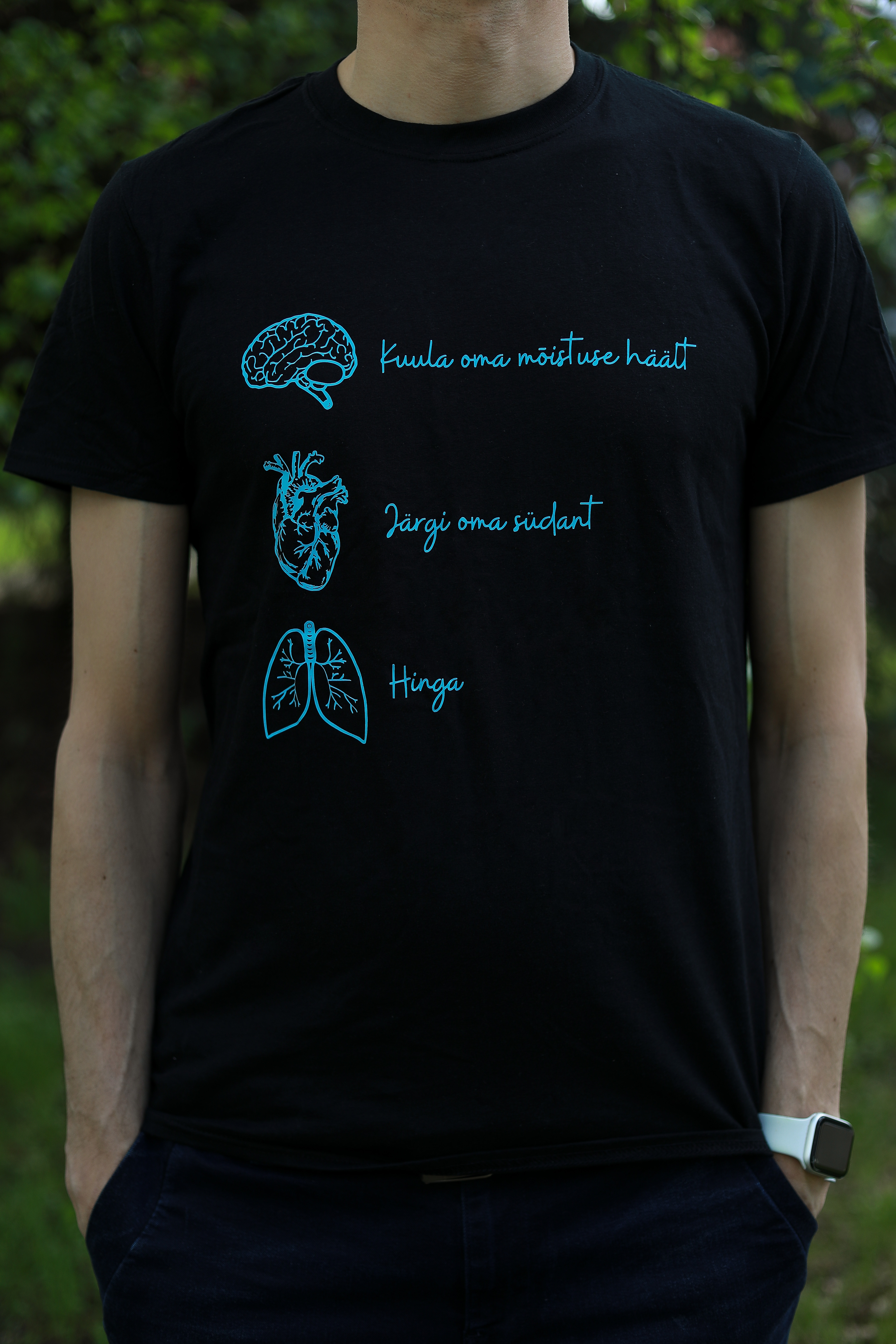 Must T-särk, sinise kirjaga, "Kuula, järgi, hinga" 14.00 EUR