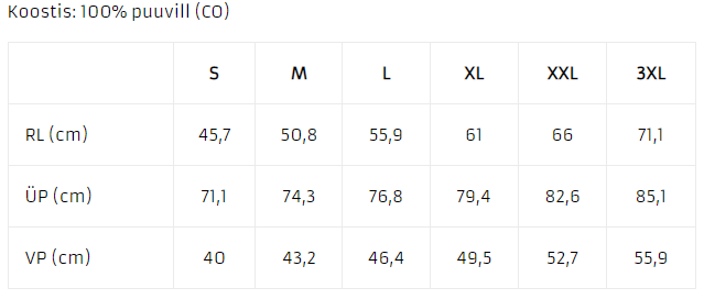 VP - varrukapikkusUnisex dressipluusi suurused: