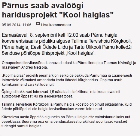 Pärnus saab avalöögi haridusprojekt "Kool haiglas" (Meditsiiniuudised) 05.09.2014